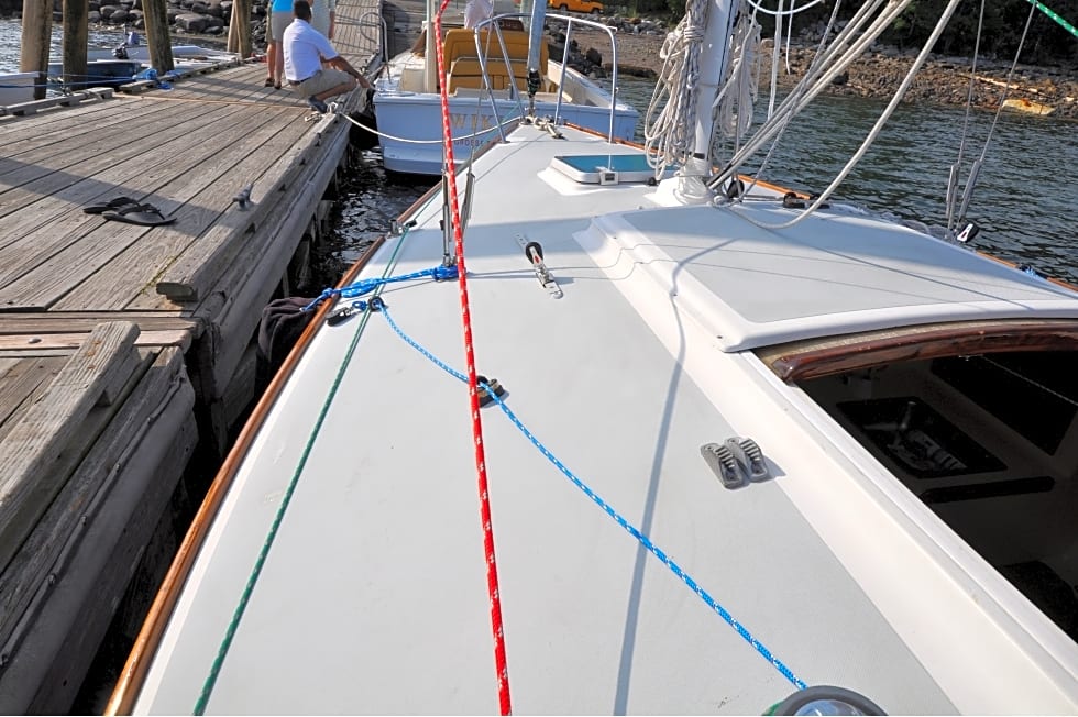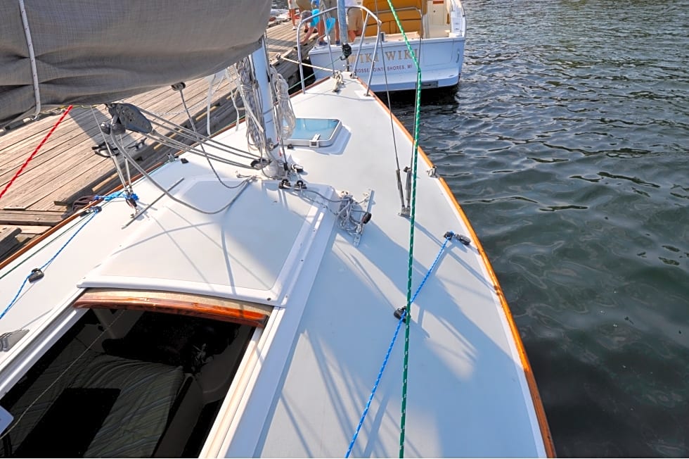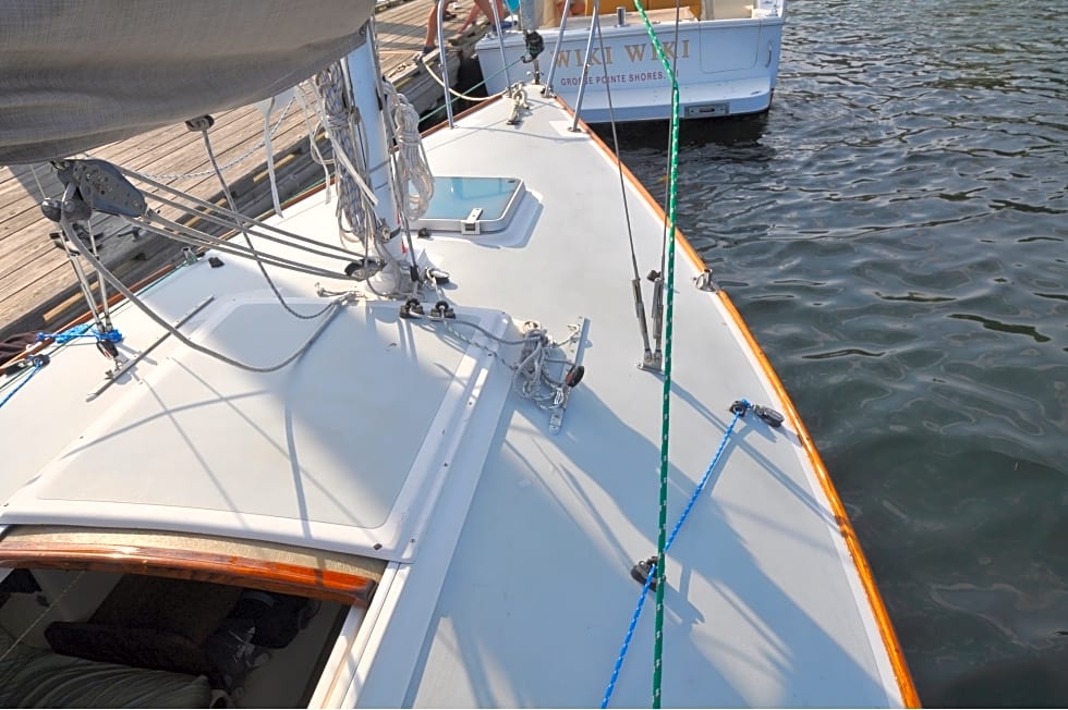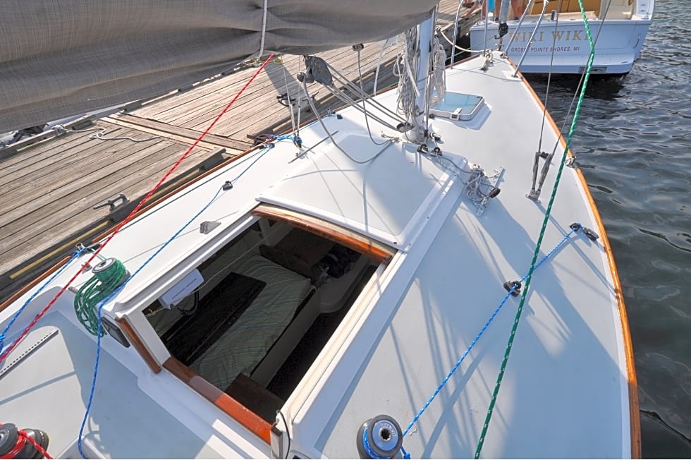 Teak and holly synthetic cabin sole (2) Adult size settee berths with large storage area below Large forward V‑berth, with two access boards above mast step area and three inspection ports for access into v‑berth compartment. Waterproof interior lights, 3 function electrical panel. Molded sink with one flexible water tank in cabinet below. Dry goods storage cabinet above sink. Cabinet doors (3) are watertight ports. Molded open storage shelves above settee berths. Molded step box with lid. Stainless lifting bar bolted to keel for hoisting. Acrylic companionway board on white PVC runners.