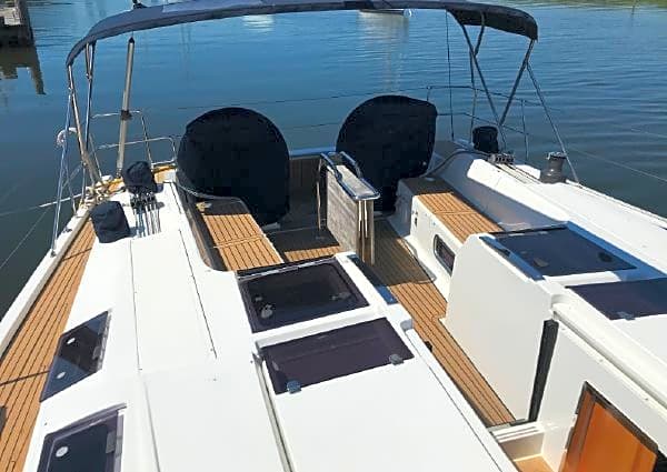 Salon: Longitudinal full-size galley on port with worktop in seashell white Plentiful storage above and below counter. Centerpiece with double settee and bottle storage and integrated ice bucket. Comfortable L-shape settee on starboard. Large folding saloon table. Lockers along the hull. Light and ventilation provided by 2 full size overhead flush hatches, 4 side opening coach roof windows, 4 full size port lights and 2 small overhead flush hatches for bunk cabin and head.
